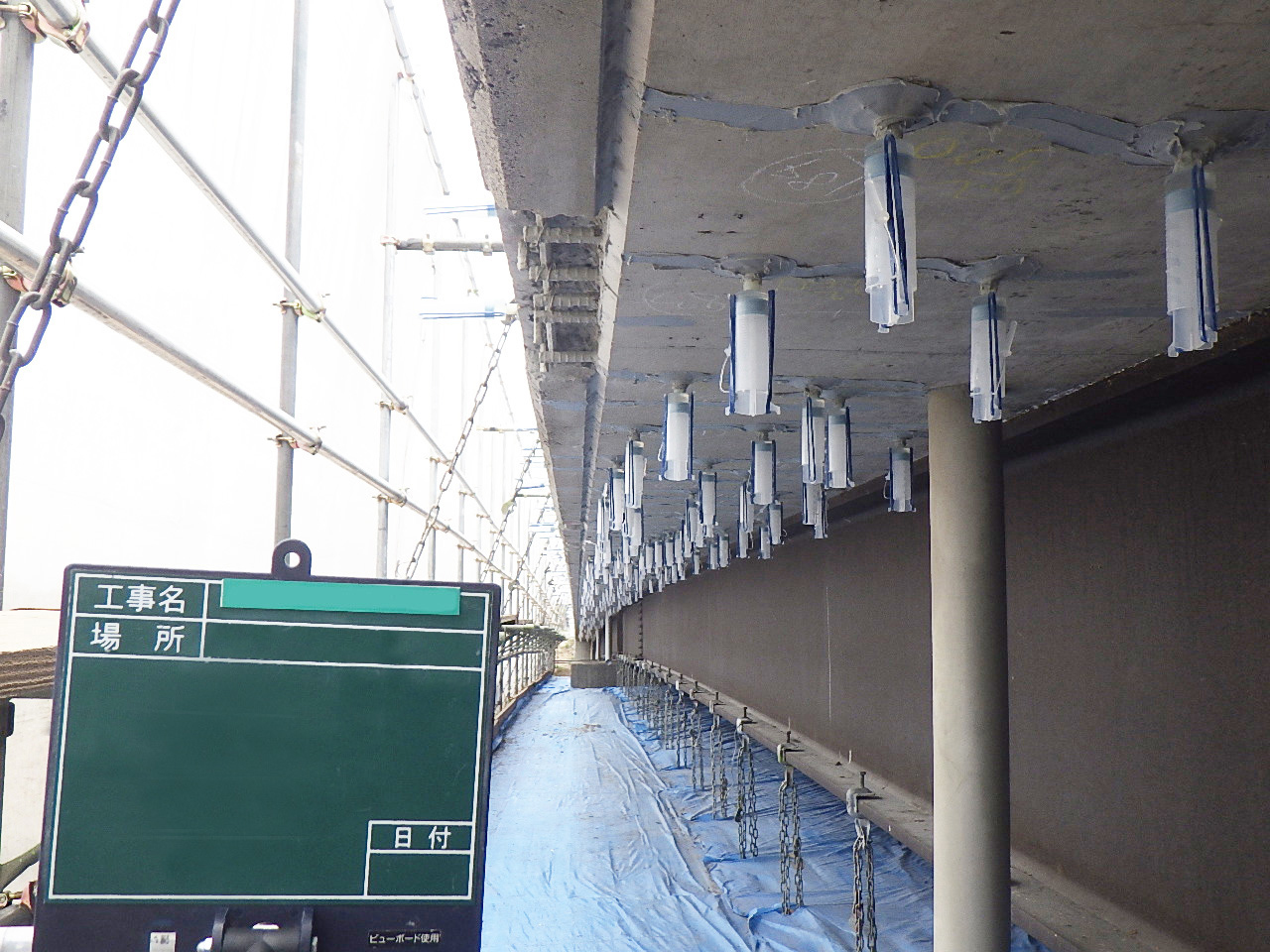断面修復工法(左官・吹付)、アンカーピンニング工法、炭素繊維補強工法